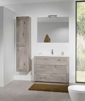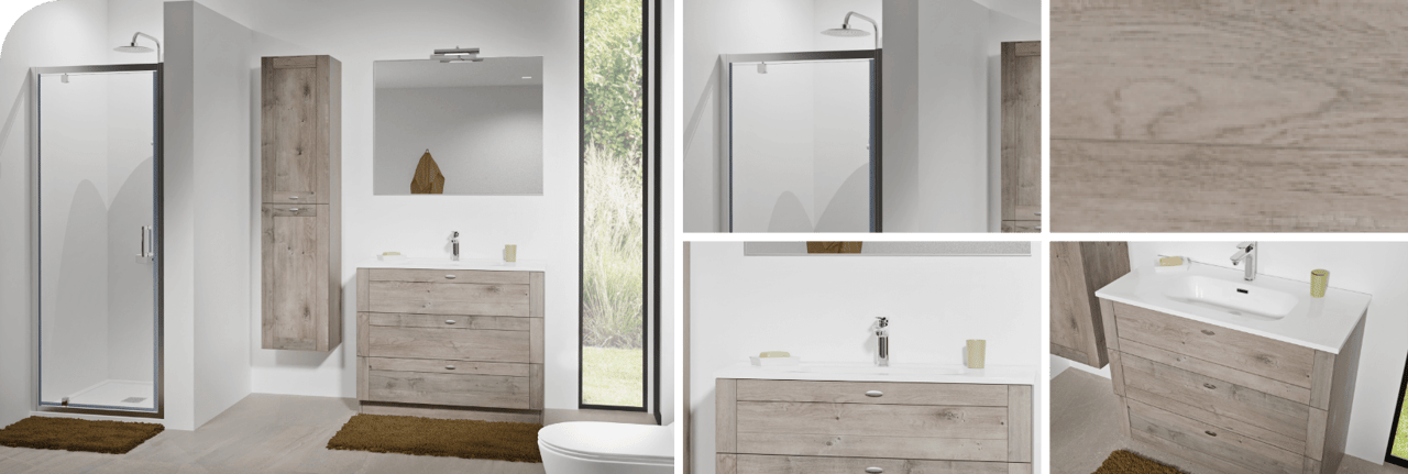 Een badkamer waar natuurlijke elegantie en eigentijds comfort samenkomen. De subtiele grijze houtlook brengt een authentieke uitstraling, terwijl de strakke chroomaccenten zorgen voor een moderne touch. Dankzij slimme opbergruimte blijft deze badkamer overzichtelijk en rustgevend, perfect voor een ontspannen start van de dag.