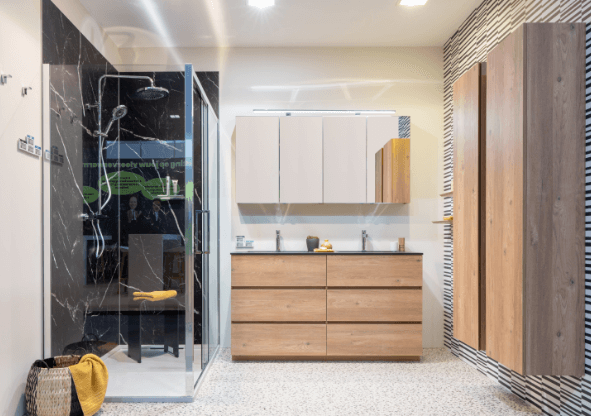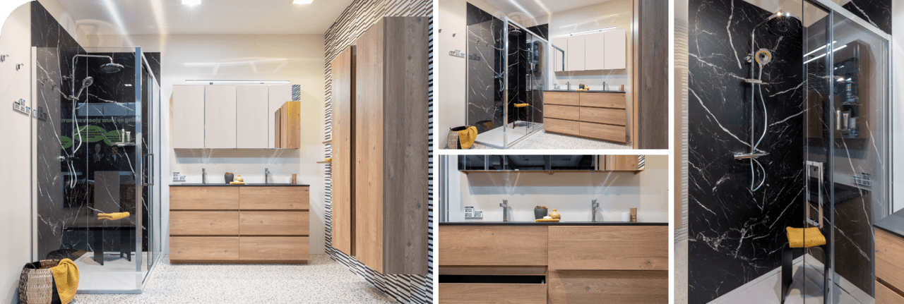 In deze badkamer komt warme houtlook perfect samen met uitgesproken accenten. De zwarte douchewand in marmerlook geeft de ruimte een krachtige uitstraling, terwijl de royale kastenwand en greeploze ladekast zorgen voor een zee aan opbergruimte. Praktisch én stijlvol tot in de details.