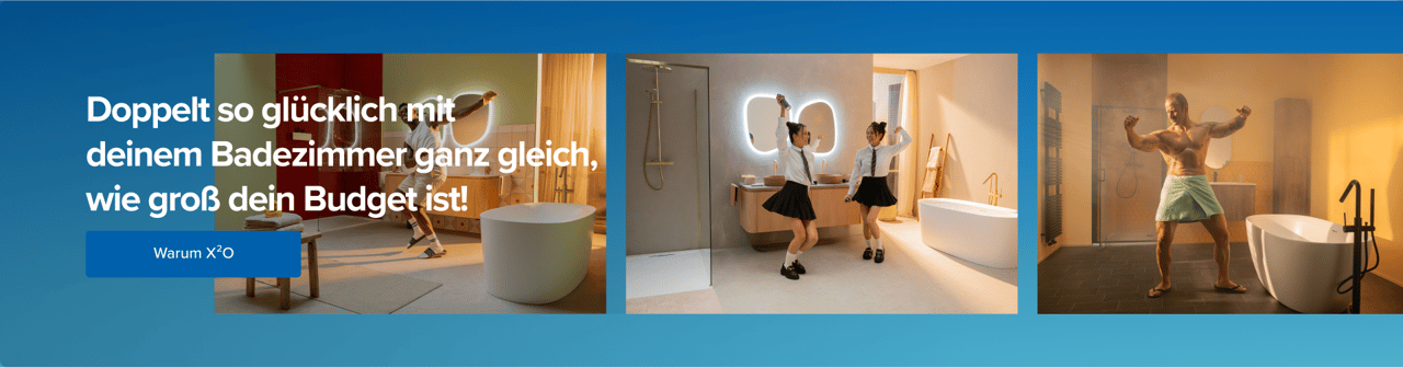 Entscheide dich für mehr Badezimmer. Für jedes Budget und jede Situation findet man bei X²O ein tolles Badezimmer. Darüber hinaus kann man bei X²O Badezimmer von Rabatten von bis zu 50 % auf das gesamte Sortiment profitieren, einschließlich Badezimmermöbeln, Badewannen, Duschen, Armaturen, Waschtischen und Waschbecken.