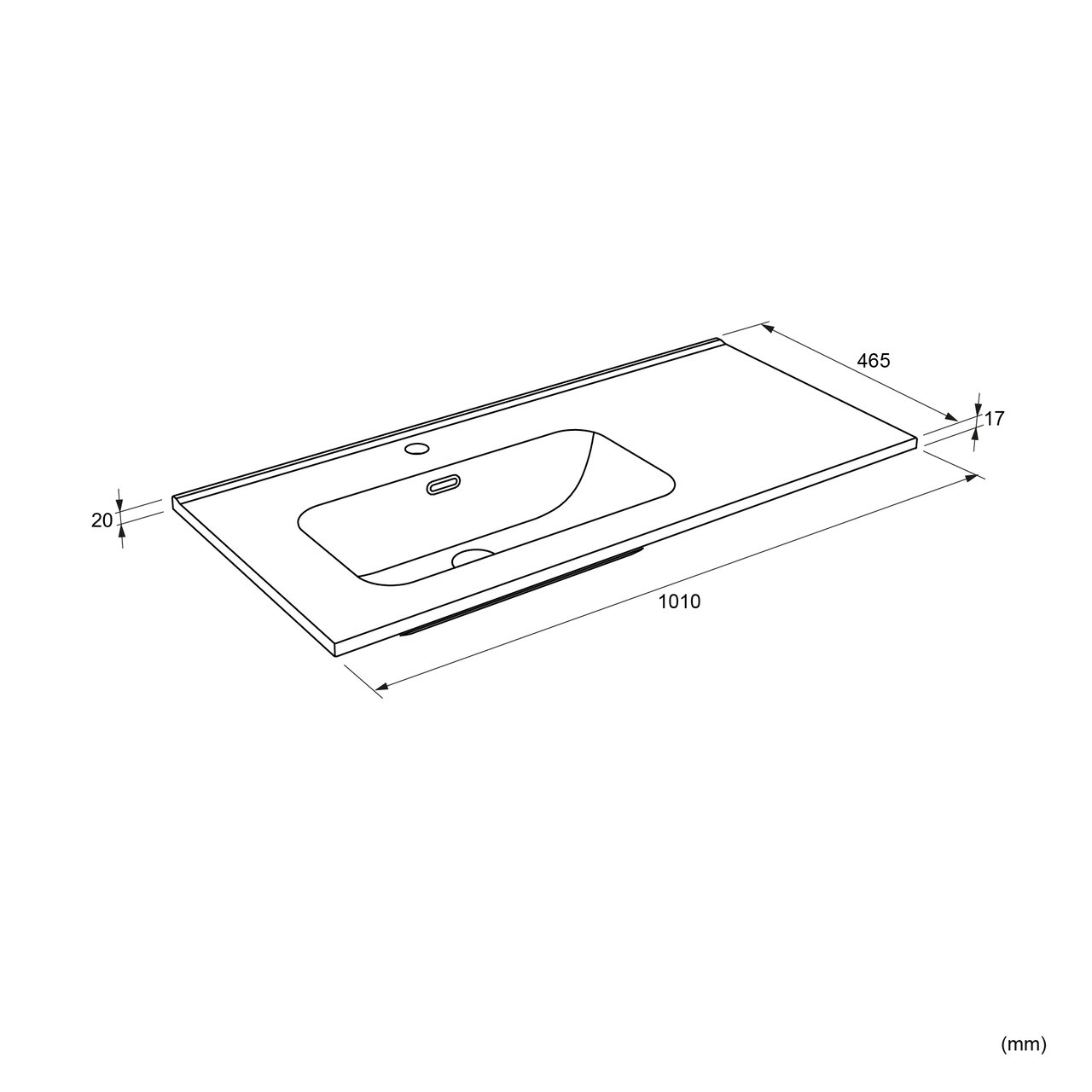 Dieses erstklassige Porzellan-Waschbecken mit integriertem Waschbecken ist 100 cm breit, 46 cm tief und hat eine Randhöhe von 2 cm. Dieses schöne matt weiße Waschbecken ist der Blickfang in Ihrem Bad.