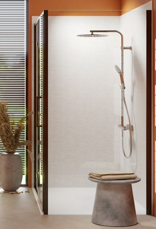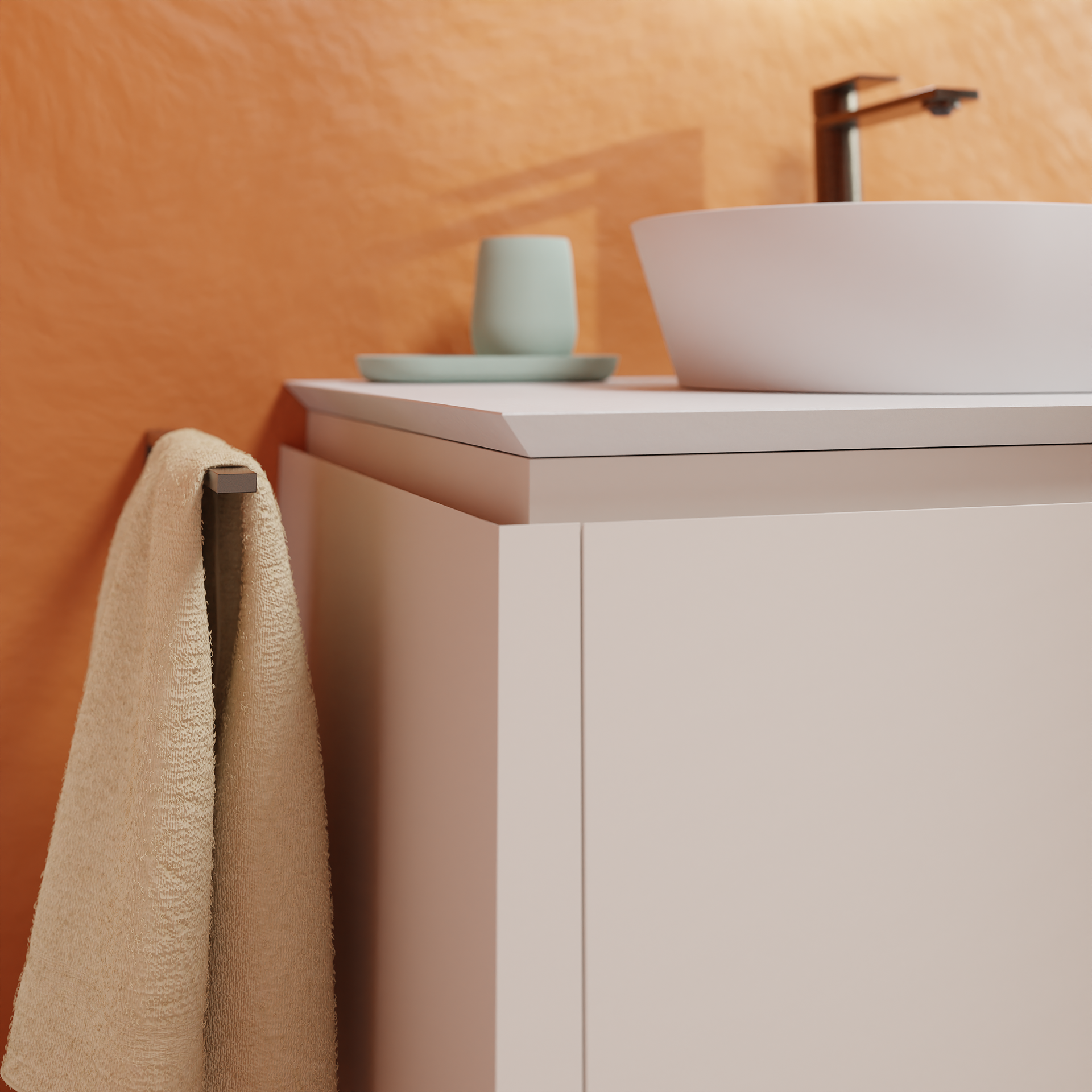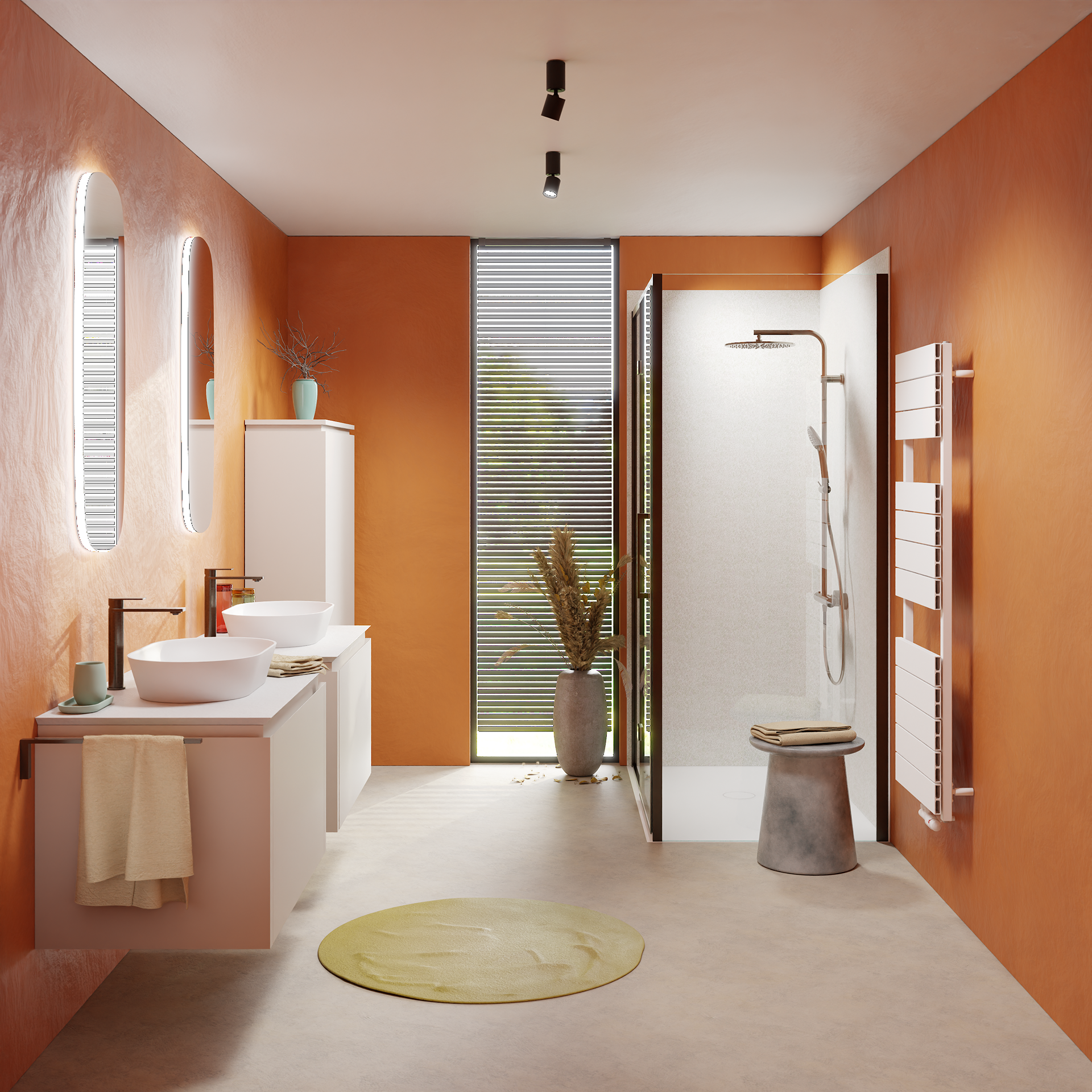 Der Frühling ist in diesem Badezimmer immer präsent! Die orangefarbenen Wände schenken dir jeden Morgen Energie. Das Balmani Eclips-Badmöbel in Sandbeige sorgt für eine weiche, ausgewogene Basis. Gunmetal ist ein tiefgrauer Metallton, der weicher wirkt als Chrom. Die Blaufoss Bodan-Waschtischarmatur und das Bodan-Regenduscheset in Gunmetal passen perfekt zu den warmen Farbtönen dieses Badezimmers. So liegst du voll im Trend.