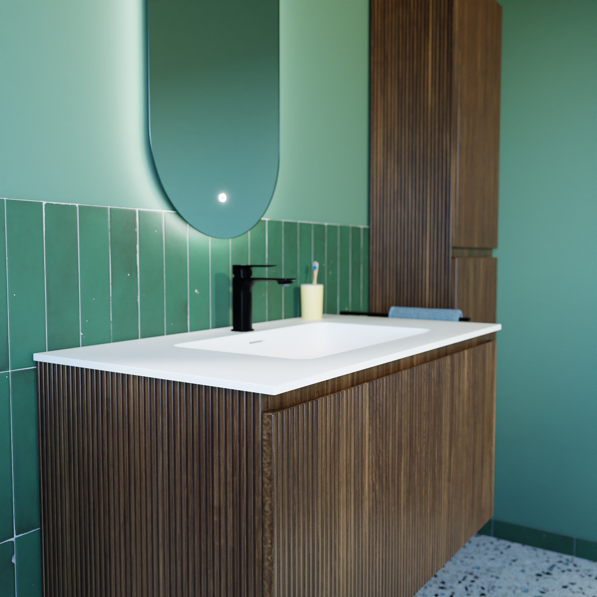 ✔ Das Storke Ribs-Badmöbel und der Hochschrank aus Nussbaum bringen Wärme in den Raum