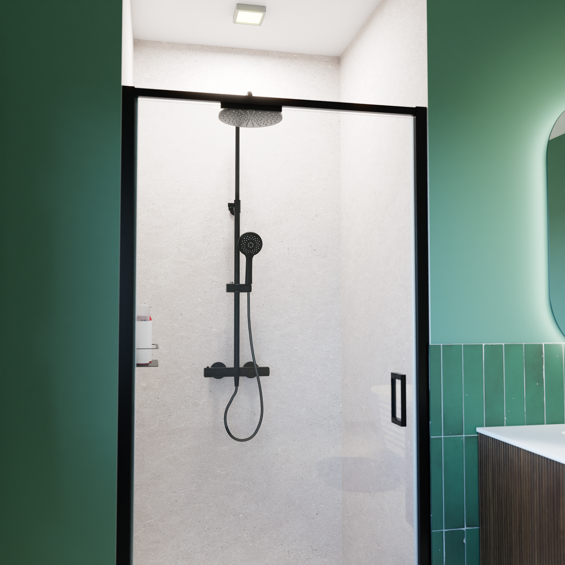 ✔ Die Nischendusche mit schwarzer Duschtür rundet das Gesamtbild perfekt ab