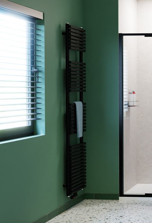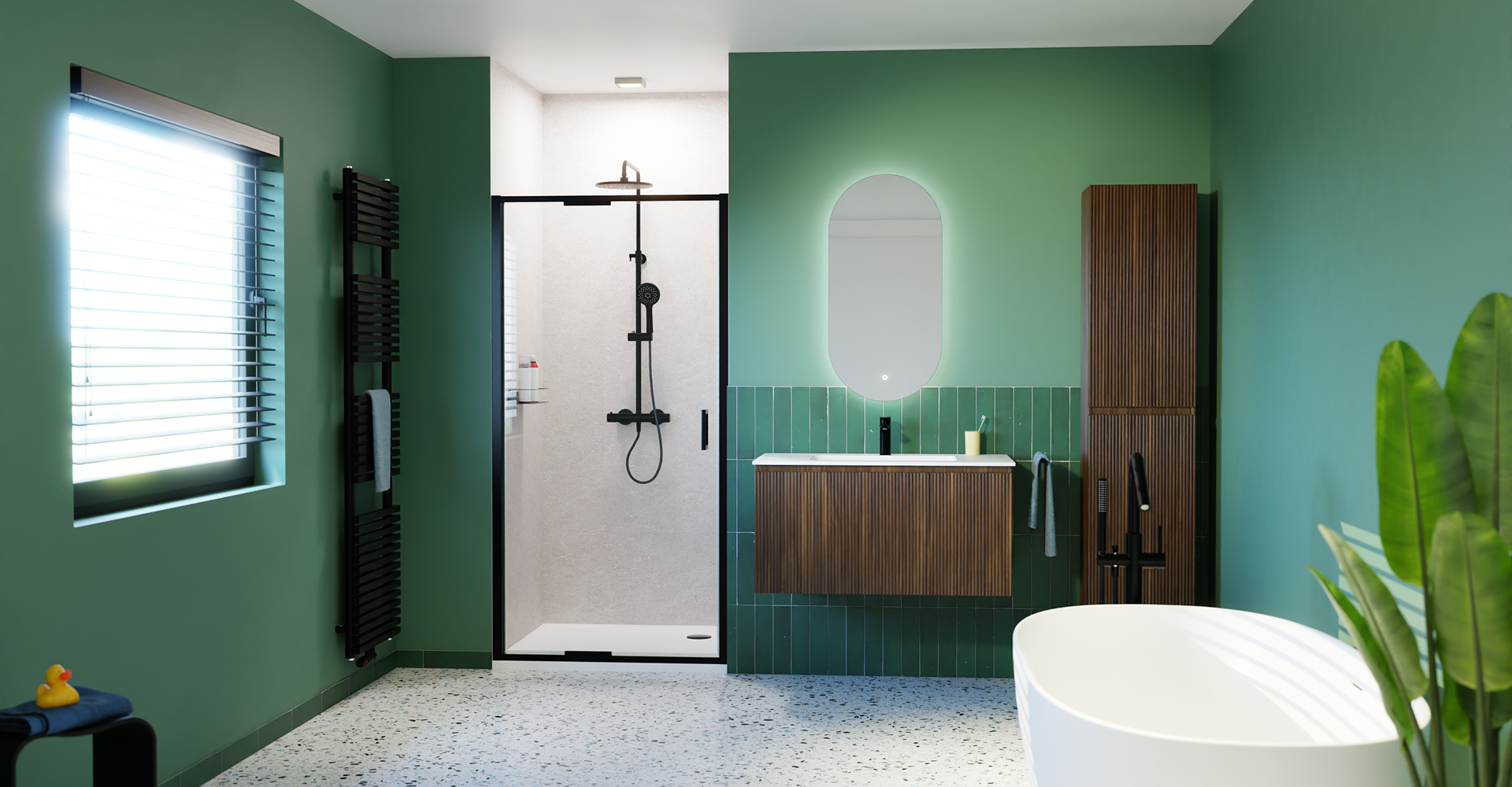 Dieses Badezimmer spielt mit Kontrasten: Grüne Wände schaffen Ruhe, während der Terrazzo-Look für eine verspielte Note sorgt. Zusammen bilden sie eine perfekte Balance zwischen Entspannung und Charakter. Das Storke Ribs-Badmöbel aus Nussbaum mit dem Storke Mata-Waschbecken sind die Blickfänger des Raumes, ergänzt durch die freistehende Badewanne Luca Varess Marcia in Matweiß. Die Nischendusche mit schwarzer Duschtür und schwarzen Armaturen verleiht dem Raum das gewisse Etwas. Ein stilvolles Badezimmer mit Persönlichkeit!