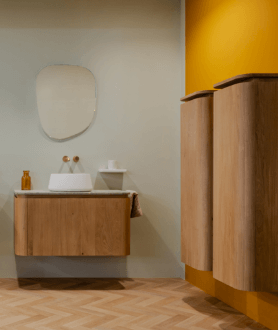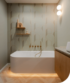 Ein Badezimmer, in dem weiche Rundungen auf markante Materialien treffen. Dieses Design vereint die Ruhe und Schlichtheit des Japandi-Stils mit warmen Holztönen und subtilen Kontrasten. Eine harmonische Kombination aus Minimalismus und ausdrucksstarker Eleganz – ein Ort der vollkommenen Entspannung.