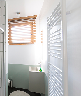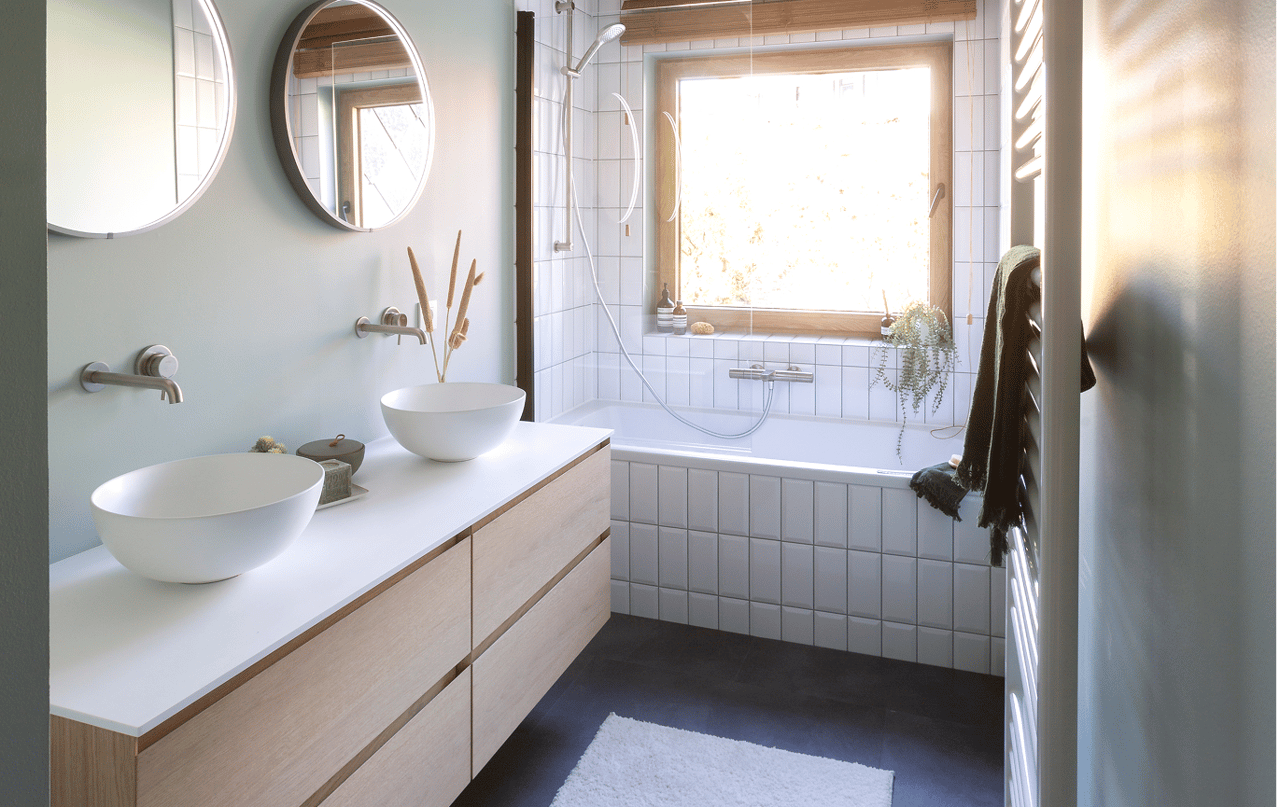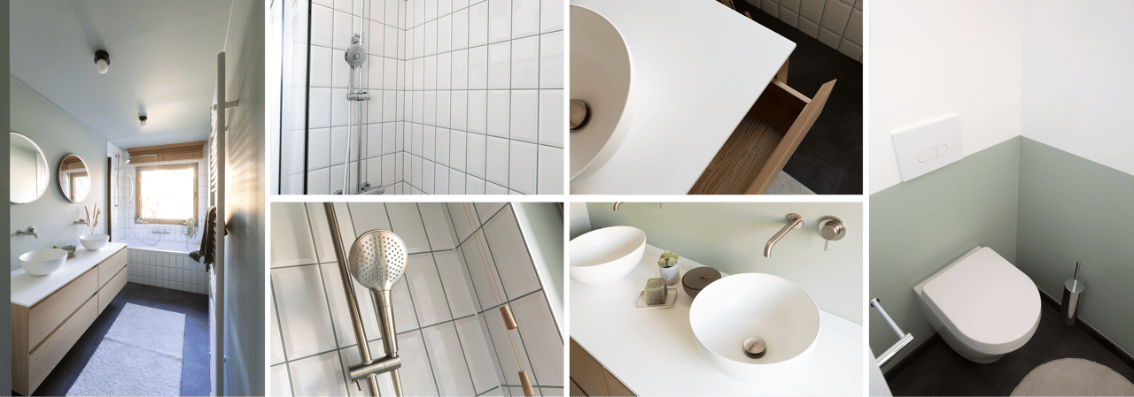 Dieses Badezimmer vermittelt Ruhe durch sanfte Grüntöne, Weiß und helle Holzdetails. Die klare Linienführung und das minimalistische Design schaffen eine offene, beruhigende Atmosphäre. Runde Spiegel und Aufsatzwaschbecken sorgen für eine weiche Note, während weiße Wandfliesen einen dezenten Retro-Charme versprühen.