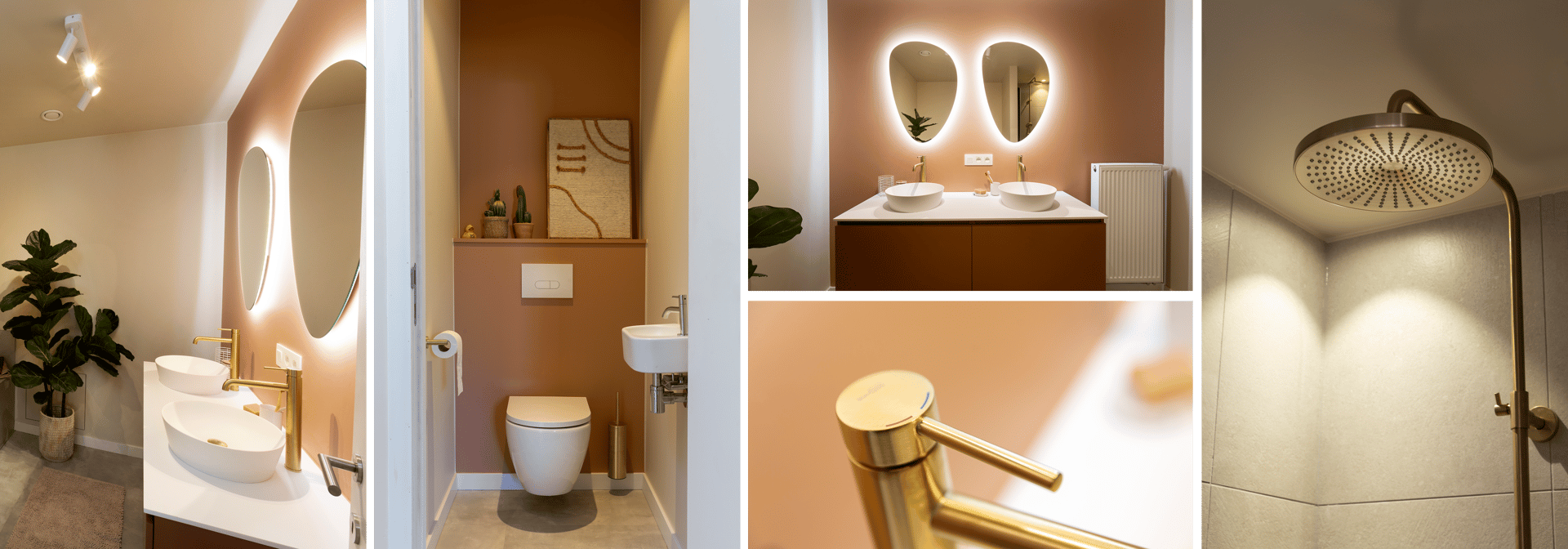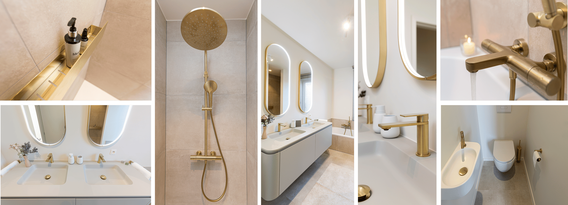 Dieses Badezimmer vereint Ruhe und Raffinesse durch die Kombination aus sanften Erdtönen und modernen Akzenten. Die goldenen Armaturen und die Regendusche verleihen dem Raum einen Hauch von Luxus, während die ovalen Spiegel mit indirekter Beleuchtung eine behagliche Atmosphäre schaffen. Das klar gestaltete Möbelstück mit zwei Waschbecken verbindet Eleganz mit Funktionalität, und die durchdachte Dekoration verleiht dem Raum Charakter. Die separate Toilette fügt sich nahtlos in das Gesamtkonzept ein – mit subtilen, funktionalen Details. Ein Bad, in dem Komfort und Stil perfekt harmonieren.