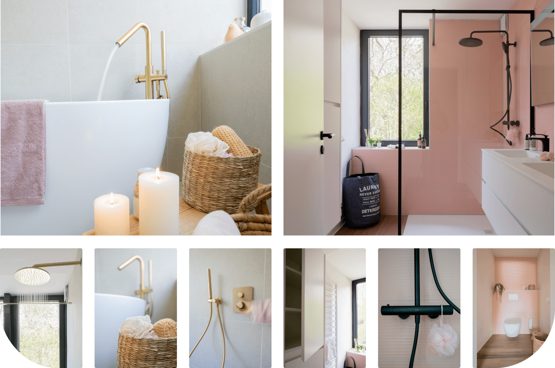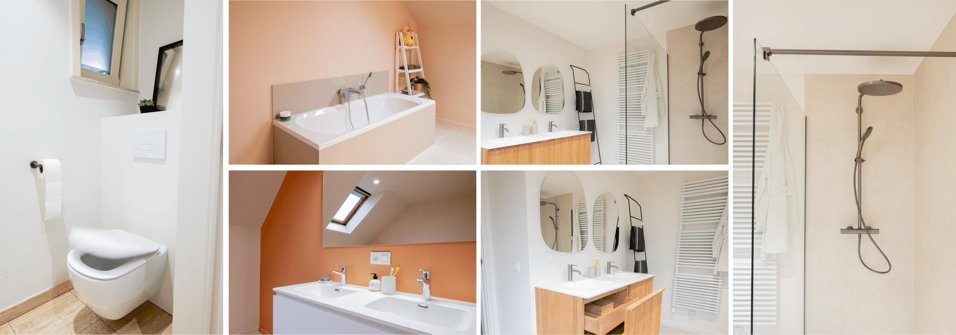 In diesem Zuhause ergänzen sich zwei unterschiedlich gestaltete Badezimmer zu einem stimmigen Gesamterlebnis. Das erste Bad überzeugt mit warmen Pfirsichtönen, einer gemütlichen Badewanne und einem Doppelwaschbecken unter dem Dachfenster. Das zweite Bad kombiniert helle Materialien, ein stilvolles Holzwaschmöbel mit offenen Schubladen und sanft gerundete Spiegel – für eine natürliche, ruhige Atmosphäre. Beide Räume bieten clevere Aufteilungen, Walk-in-Duschen und viel Tageslicht – ideal für stilbewusste Badliefhebbers.