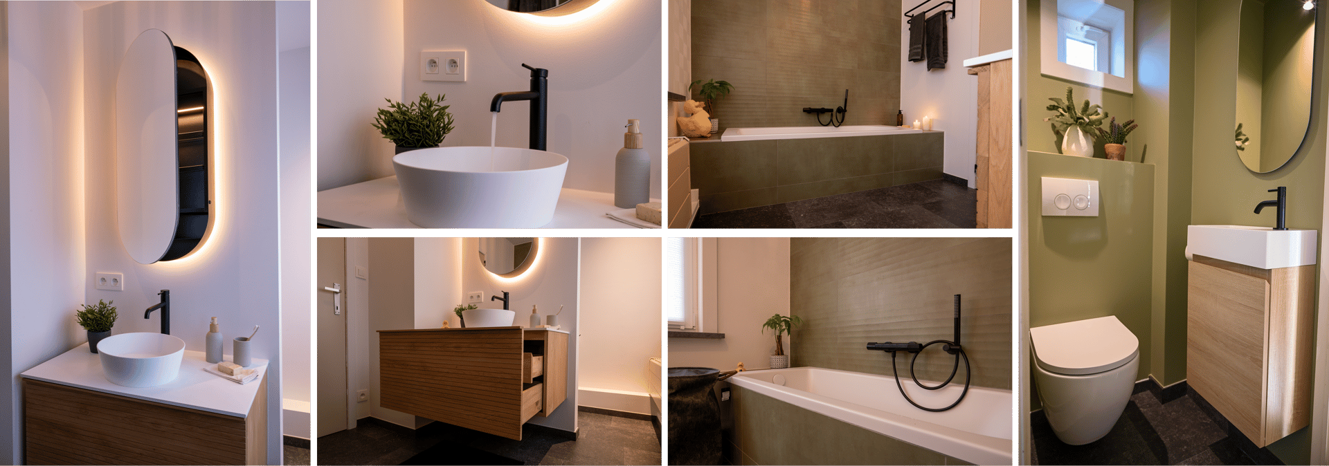 Dieses Badezimmer vereint natürliche Erdtöne mit klaren Linien und cleveren Stauraumlösungen. Die olivgrüne Akzentwand verleiht Charakter, während das Holzwaschmöbel mit zwei Schubladen praktischen Platz bietet. Der Spiegel mit integrierter Beleuchtung und Stauraum schafft Atmosphäre und Funktion zugleich. Die großzügige Badewanne rundet das Wellness-Gefühl ab – ein stilvoller Raum für Komfort und Entspannung.