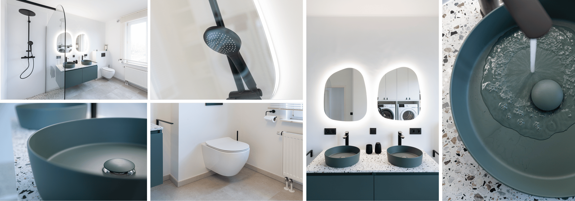 Klare Linien, markante Akzente und stilvolle Kontraste verleihen diesem Badezimmer eine moderne Ausstrahlung. Die matten Aufsatzwaschbecken in Grün harmonieren perfekt mit der Terrazzo-Arbeitsplatte und den schwarzen Armaturen. Die organisch geformten Spiegel mit sanfter LED-Beleuchtung schaffen Atmosphäre und Funktion zugleich. Eine bodengleiche Dusche und ein wandhängendes WC sorgen für eine offene, luftige Raumwirkung. Modernes Design trifft auf praktischen Luxus.