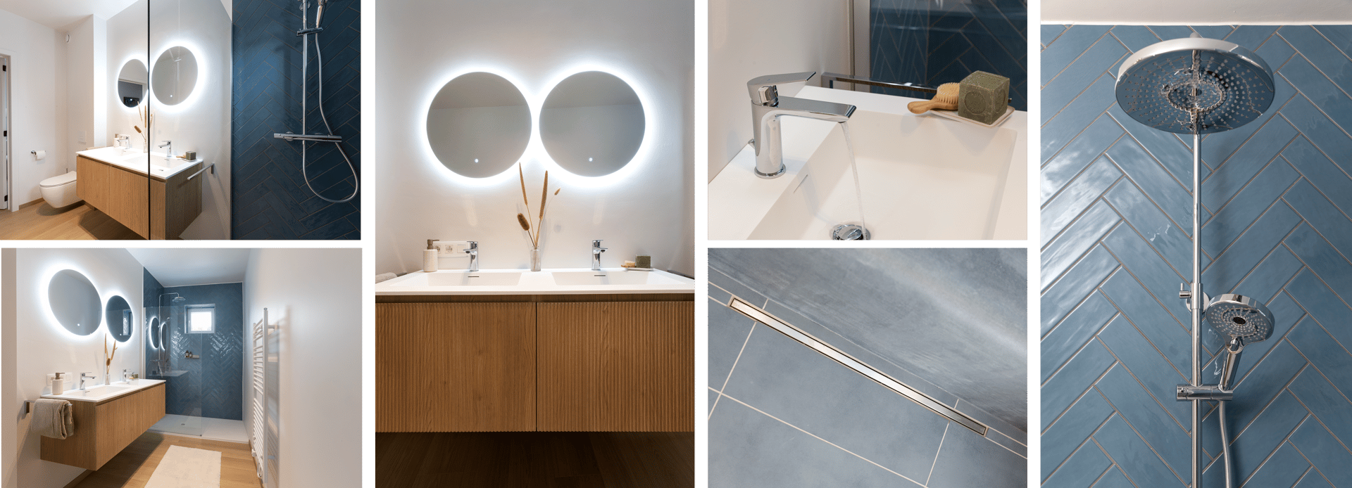 Dieses Badezimmer vereint Ruhe und moderne Eleganz. Weiße Wandfliesen schaffen eine helle, klare Basis, während das schwebende Holzmöbel Wärme ins Design bringt. Die zwei Aufsatzwaschbecken und die schlichten Wandarmaturen verleihen dem Raum eine zeitgemäße Note. Die großzügige begehbare Dusche sorgt für Komfort, und das separate WC ist stilvoll in einem sanften Grün-Grau-Ton gehalten. Ein zeitloses, harmonisches Design, das Funktionalität und Stil perfekt verbindet.