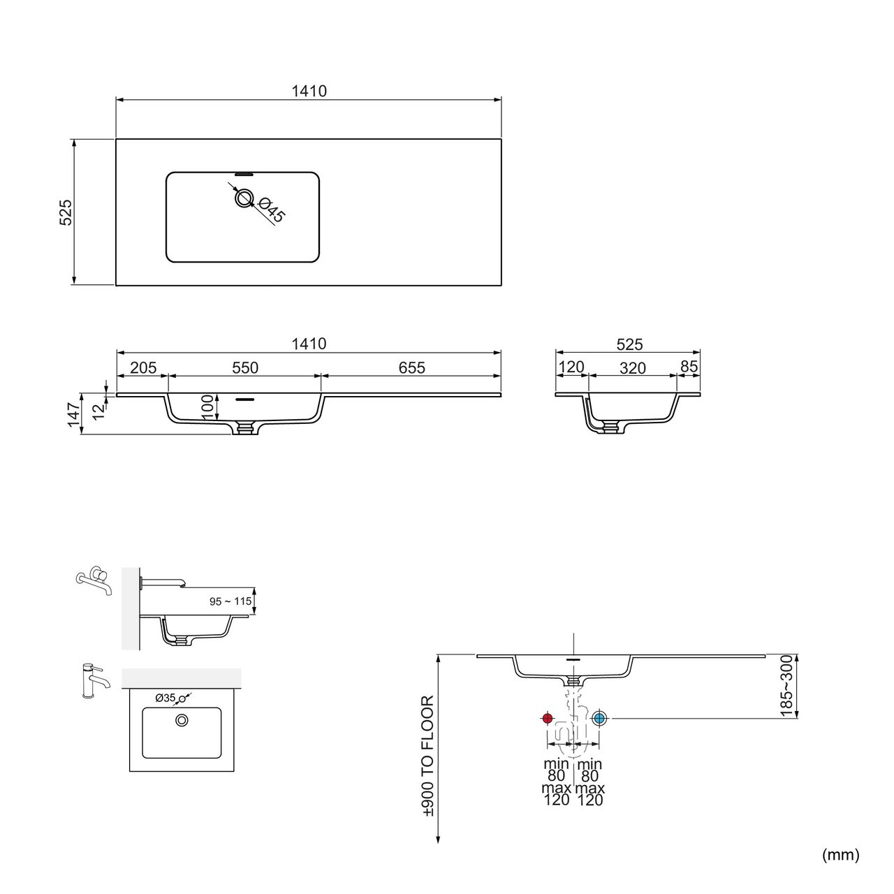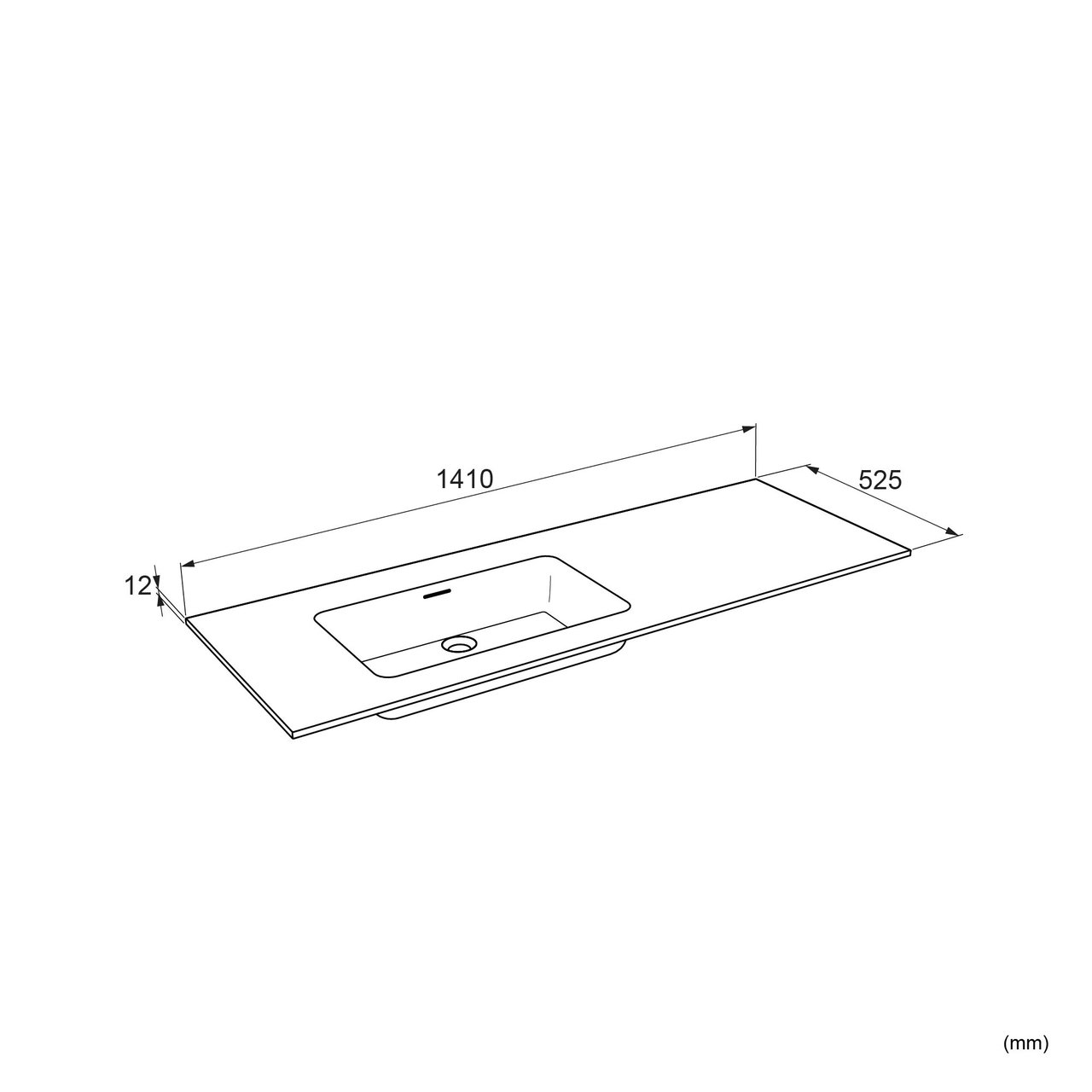 Dieser Waschtisch ist auch in anderen Größenund in einer Variante mit Randhöhe 9 cm erhältlich.