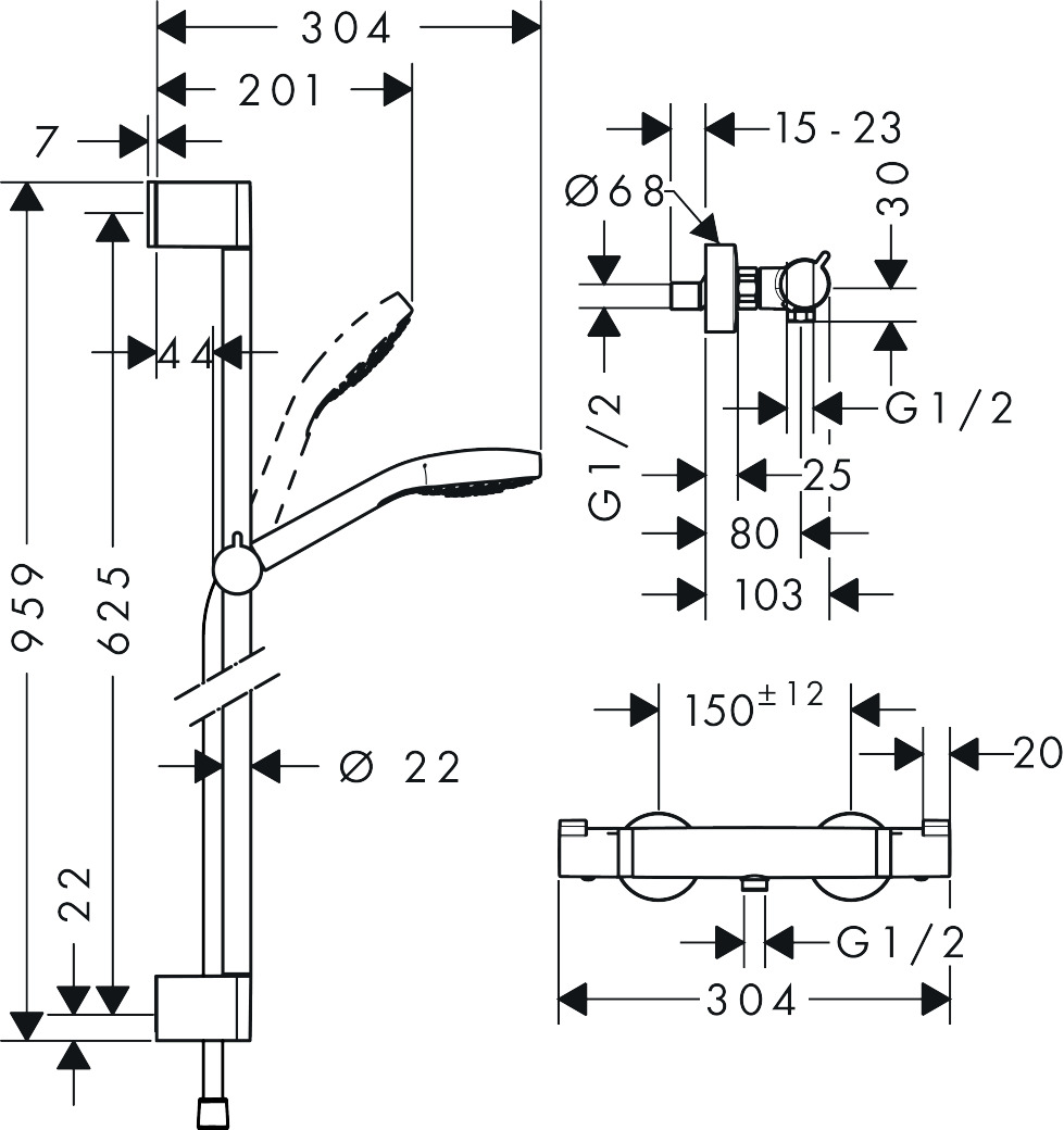 • comprenant: douche à main, thermostatique douche, barre de douche, curseur, flexible de douche