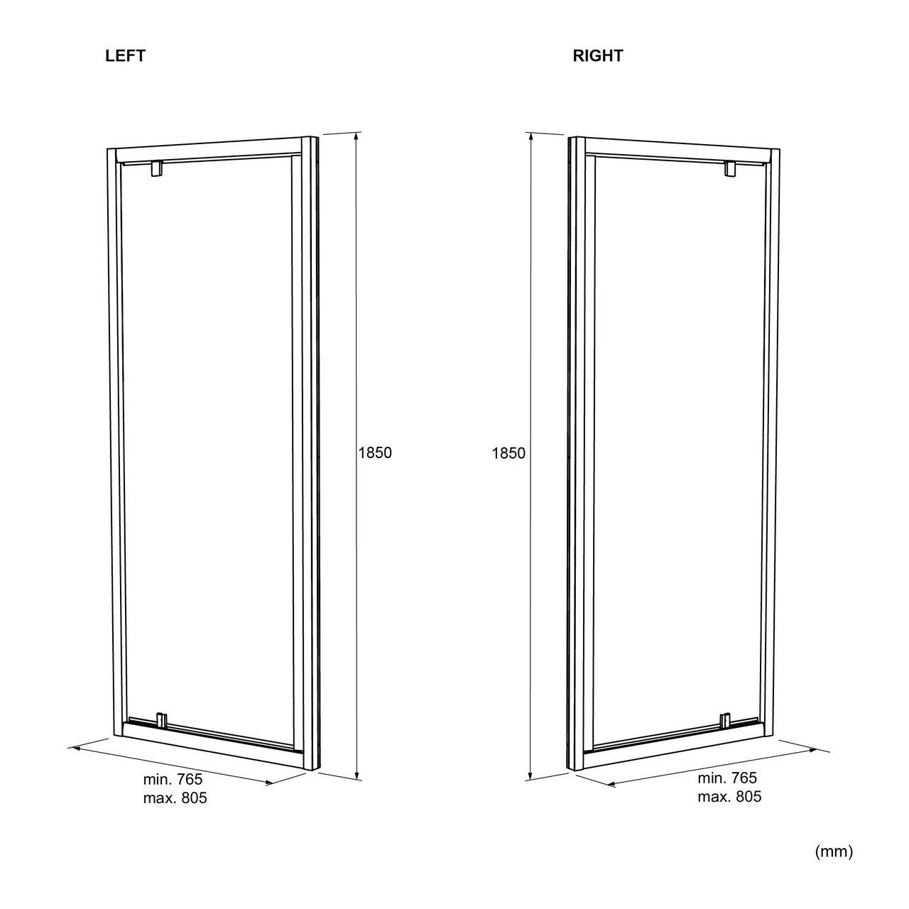 Cette porte de douche en niche mesure 80 cm de large et 185 cm de haut.