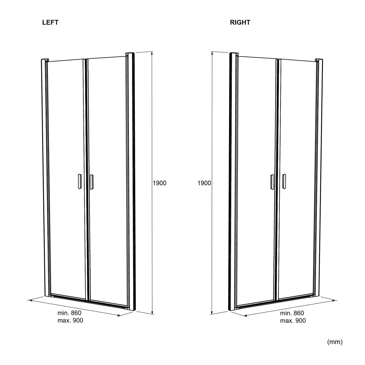 Cette porte de douche en niche mesure 90 cm de large et 190 cm de haut.