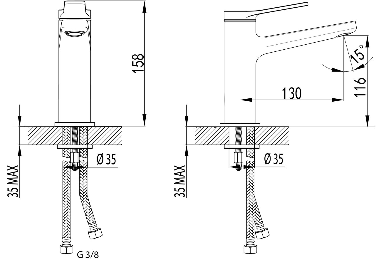 Épaisseur maximale de tablette pour l'installation du robinet | 35 mm | |