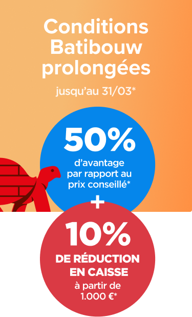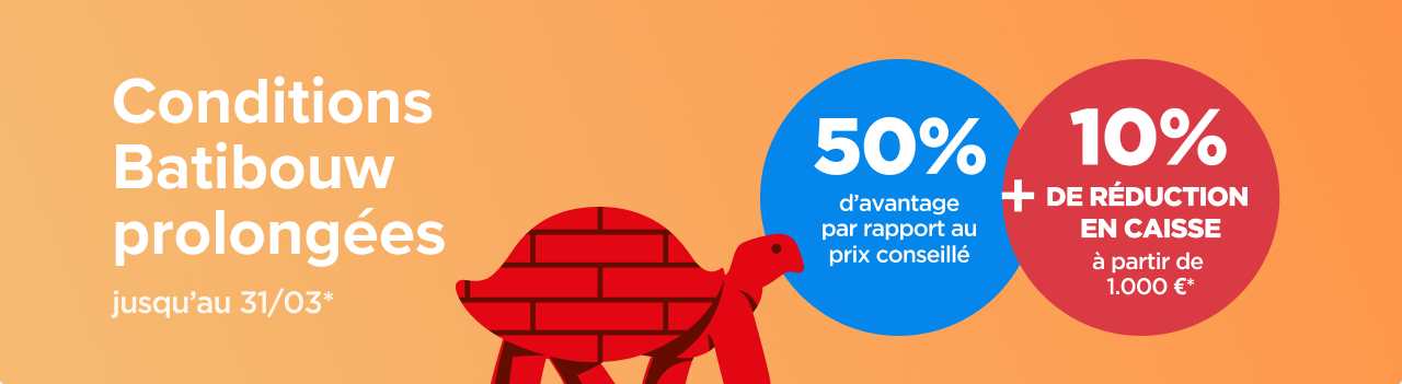 Pendant tout le mois de mars, profitez de 50 % de réduction par rapport au prix conseillé sur presque tout. Et ce n’est pas tout : en plus de cette réduction, bénéficiez de 10 % de remise en caisse dès 1.000 € d’achat.*