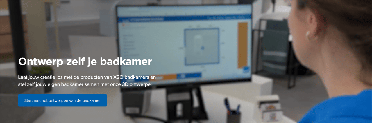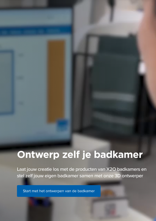 Stel jouw badkamerruimte in, sleep jouw favoriete X2O badkamerproducten in, bekijk jouw badkamer in 3D en sla op als foto.