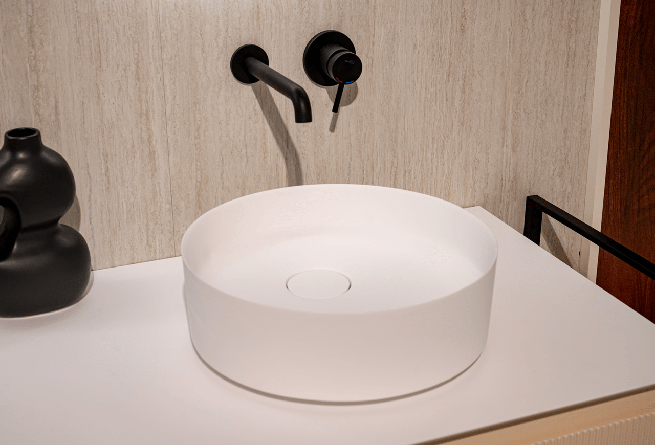 Wanneer je deze badkamer binnenwandelt voel je een kalme, uitnodigende vibe. Bart viel meteen voor de Balmani Eclips in Sandbeige. Deze wastafelonderkast past perfect bij de zachte sfeer in deze ruimte en biedt voldoende opbergruimte. De verticale groeven voegen subtiele textuur toe, terwijl de strakke hoeken een mooi contrast vormen met de zachte lijnen van de waskommen en de badkamerspiegels. Samen met het mat witte Eclips Solid Surface tablet en de Balmani Fato waskommen vormt de gehele set een stijlvolle toevoeging aan de wastafelzone.