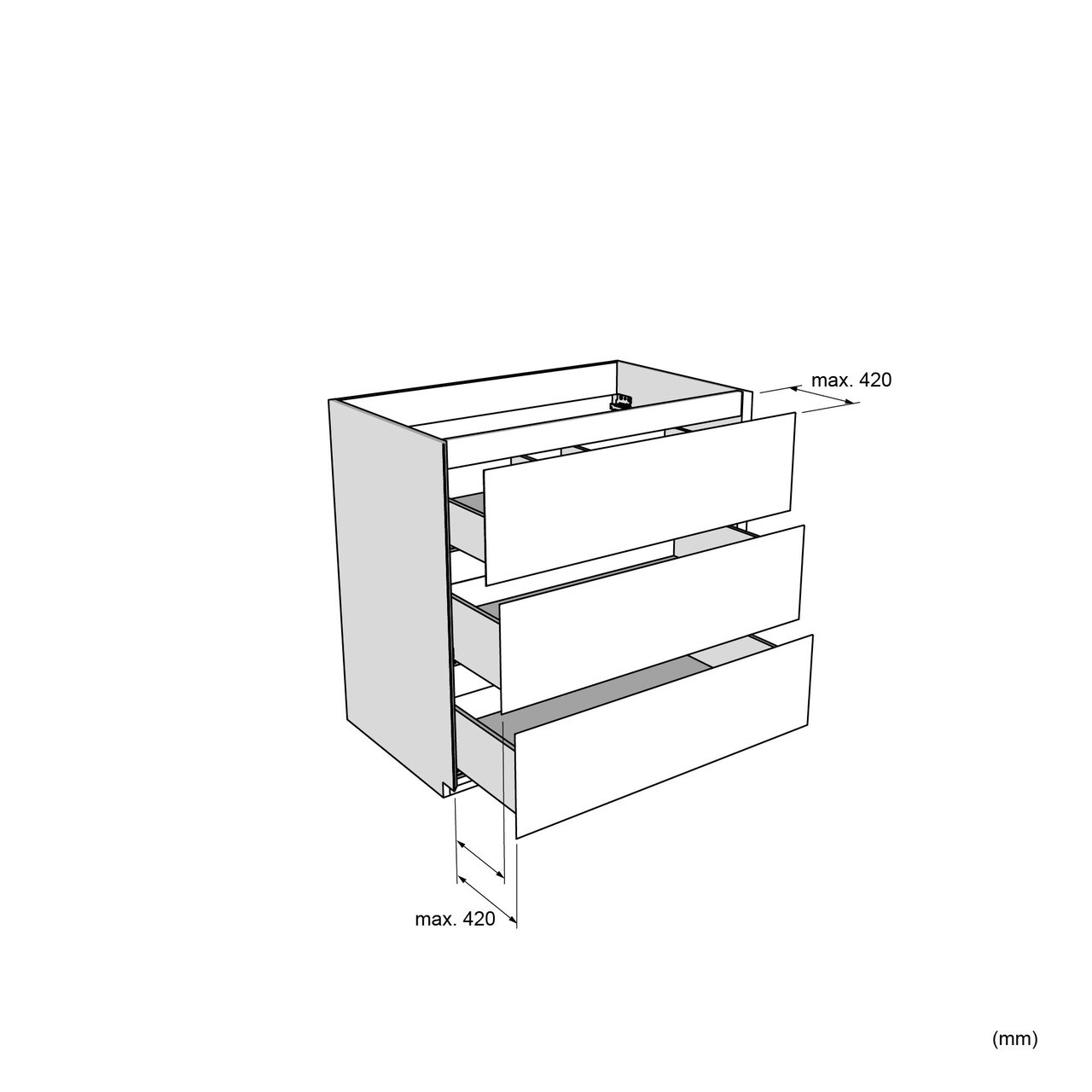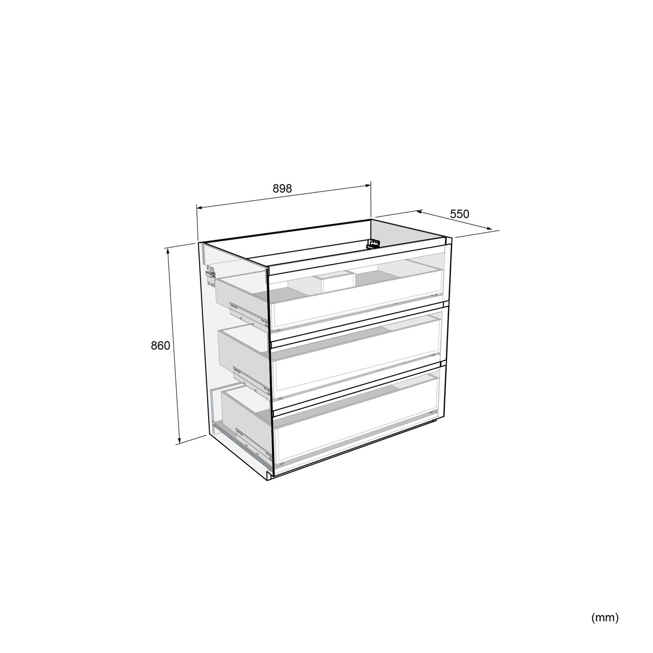 Deze eersteklas massieve natuur eik wastafelonderkast met drie lades heeft een breedte van 90 cm, een hoogte van 86 cm en een diepte van 55 cm. Deze staande kast in massieve natuur eik past in elke badkamer door zijn strakke afwerking.