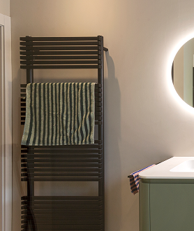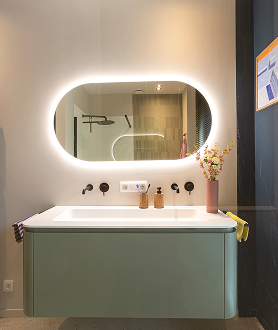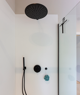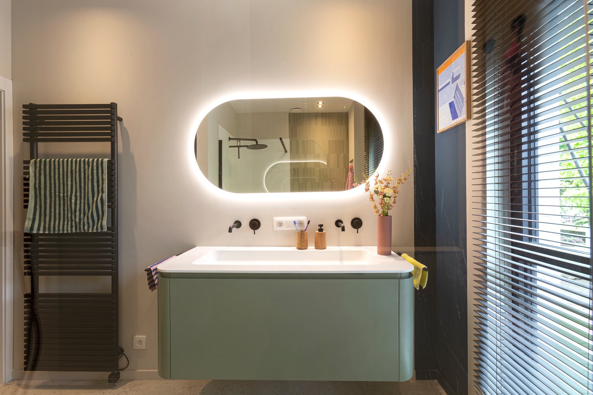 Een badkamer waar fris design en warme accenten elkaar perfect aanvullen. De combinatie van mat zwart, zachte groentinten en natuurlijke lichtinval zorgt voor een ruimte die zowel rust uitstraalt als karakter heeft. Strakke lijnen worden verzacht door afgeronde vormen en tactiele materialen – van de inloopdouche tot het greeploze meubel.