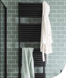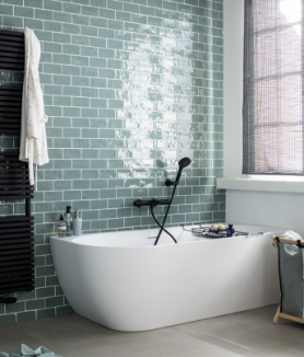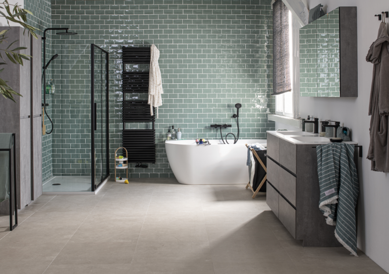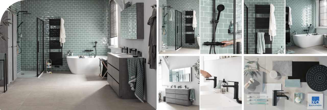 Een badkamer waarin strak design en huiselijk comfort perfect samenkomen. De matte zwarte accenten, groene wandtegels en robuuste materialen zorgen voor een industriële uitstraling die toch warm en uitnodigend aanvoelt. Dankzij de slimme indeling met kolomkast, spiegelkast en dubbele wastafel is er volop opbergruimte voor het hele gezin.