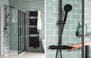 ✔ Strak & industrieel – Zwarte kranen, een matzwarte regendouche en robuuste vormen geven de ruimte karakter.