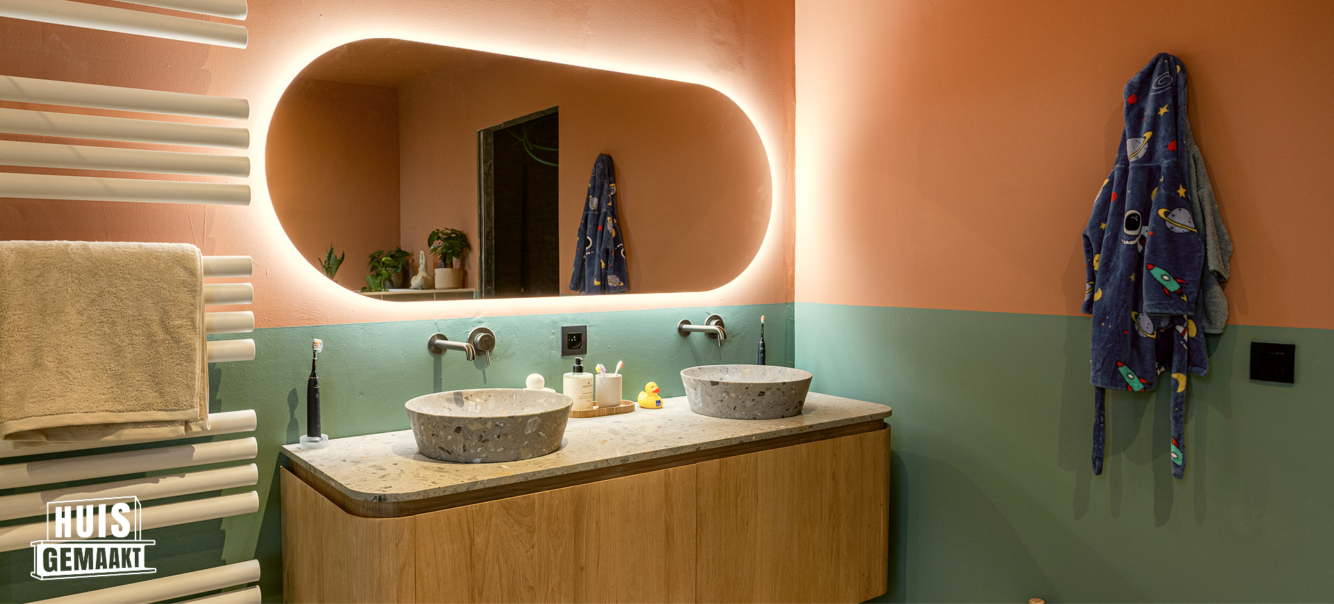 Deze gezinsvriendelijke badkamer uit “Huis Gemaakt” brengt comfort en karakter mooi samen. Kleurrijk, ruim en helemaal compleet. De combinatie van warm terracotta en zachte groentinten zorgt voor een levendige sfeer. En dankzij de slimme indeling voelt alles open en overzichtelijk aan. Met een ligbad, inloopdouche en toilet is elke vierkante meter goed benut.