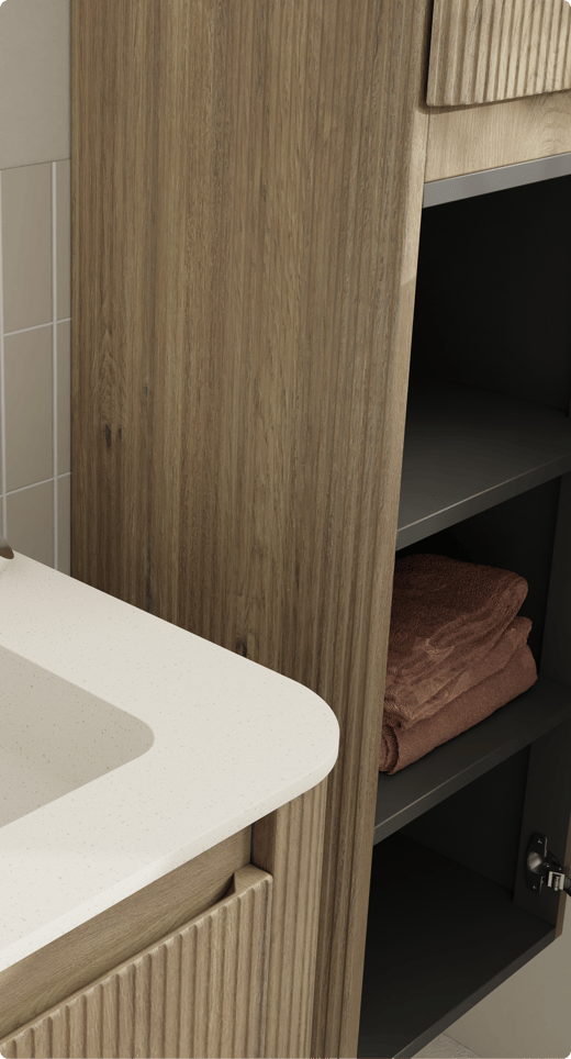 De Storke Soft wastafelonderkast in ruwe eik vormt het warme hart van de ruimte. De ribbelstructuur voegt subtiele diepte toe, terwijl de Storke Mata Soft wastafel in de kleur beige granita zorgt voor een zacht en evenwichtig geheel. Een Solid Surface wastafel is onderhoudsvriendelijk en praktisch in gebruik. Afgeronde vormen brengen rust en zijn helemaal on trend.