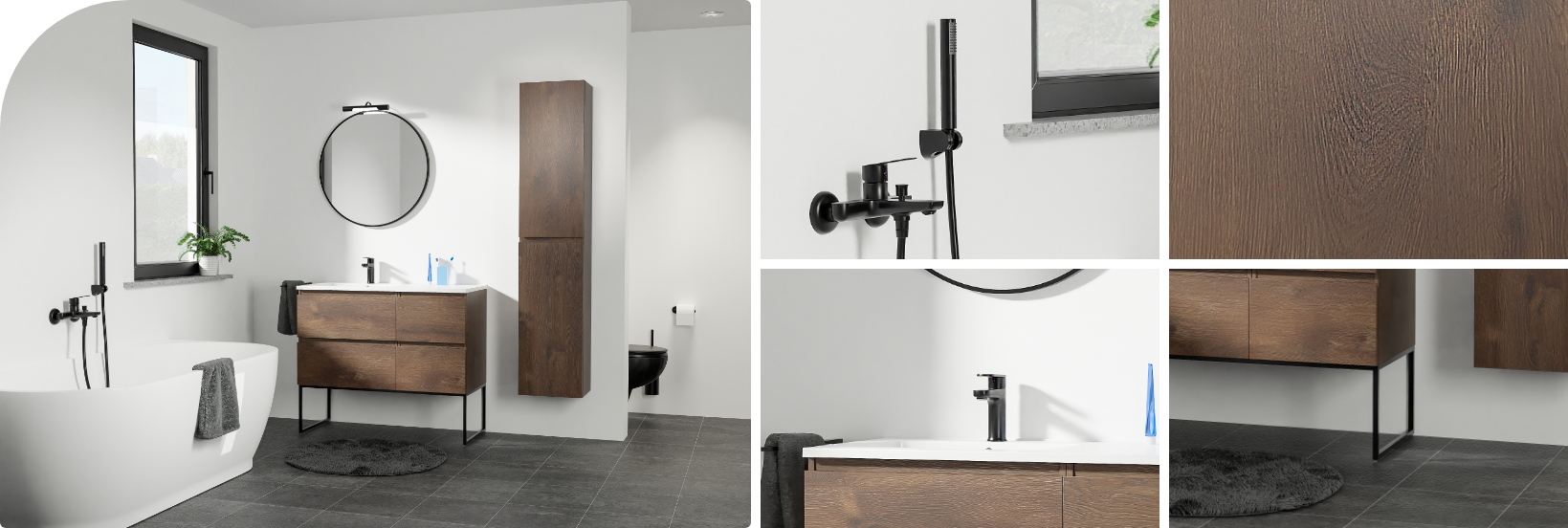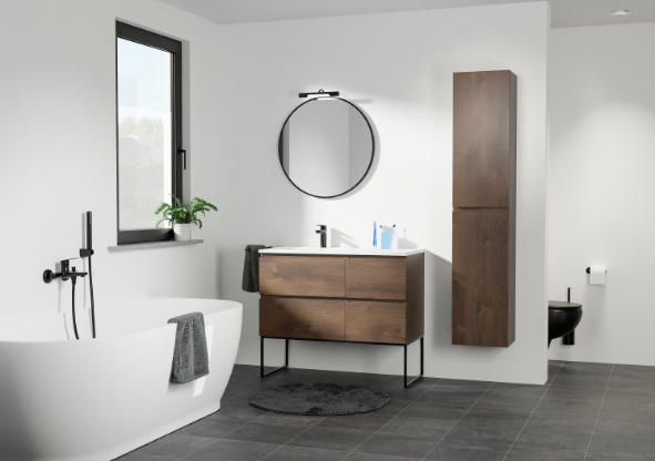 Een badkamer waar robuuste materialen en zachte harmonie samenkomen. De combinatie van zwart, hout en wit creëert een krachtig contrast met een serene uitstraling. Deze badkamer ademt de rust en eenvoud van Japandi, terwijl de warme houtlook en stoere details zorgen voor een eigentijdse en stijlvolle sfeer.