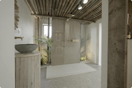 Een poolhouse was de perfecte keuze, want hier kon ze het vakantiegevoel tot leven brengen. De swimspa zorgt voor ultieme ontspanning, terwijl een luxueuze, door Bali geïnspireerde douche de ervaring compleet maakt. De natuurlijke materialen zoals de Balmani Denza Due waskom in graniet, zachte tinten en tropische details creëren een serene sfeer die hen meteen doet wegdromen.