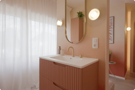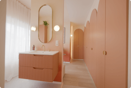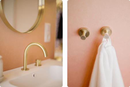 Daarnaast werd in de dressing het charmante roze badkamermeubel Linie Ribbo geplaatst met de Blaufoss Pavilion inbouwkraan in mooi Champagne Gold. In diezelfde warme kleur werkte Bart de ruimte af met de Balmani Giro oval badkamerspiegel én Balmani Pelota wandverlichting.