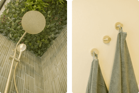 De badkamer was de perfecte keuze, want hoewel het een belangrijke plek in huis is, was ze dringend toe aan renovatie. Het resultaat is een oase van rust, met warme groentinten, stijlvolle tegels en de moderne Luca Varess Senses douche met zwarte accenten. Elk detail straalt luxe uit, van de elegante glazen wand tot de Champagne Gold Uma wandplankjes (linken) die perfect matchen met de Champagne Gold kranen.