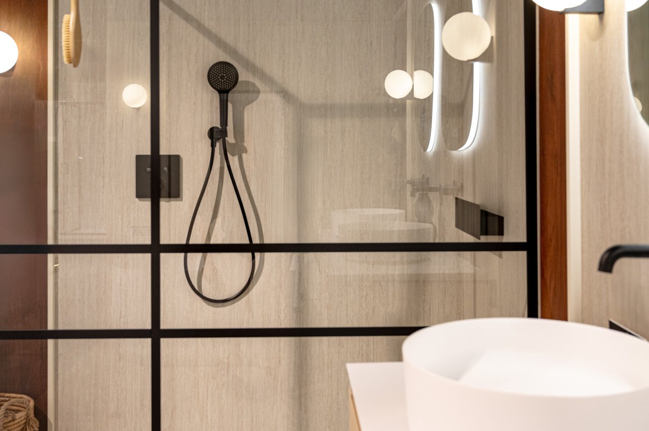 Bart koos resoluut voor een open gevoel in de doucheruimte. Een glazen douchewand en een witte douchebak zorgen voor een heldere, lichtrijke douche-ervaring. Tegelijk brengen strakke, zwarte lijnen en zorgvuldig uitgekozen details — zoals de zwarte inbouw regendouche en wandplank — extra karakter in het geheel. Zo bewijst Bart eens te meer zijn gevoel voor verfijning en perfectie. De douchewandpanelen in travertinlook geven de doucheruimte een warme touch.