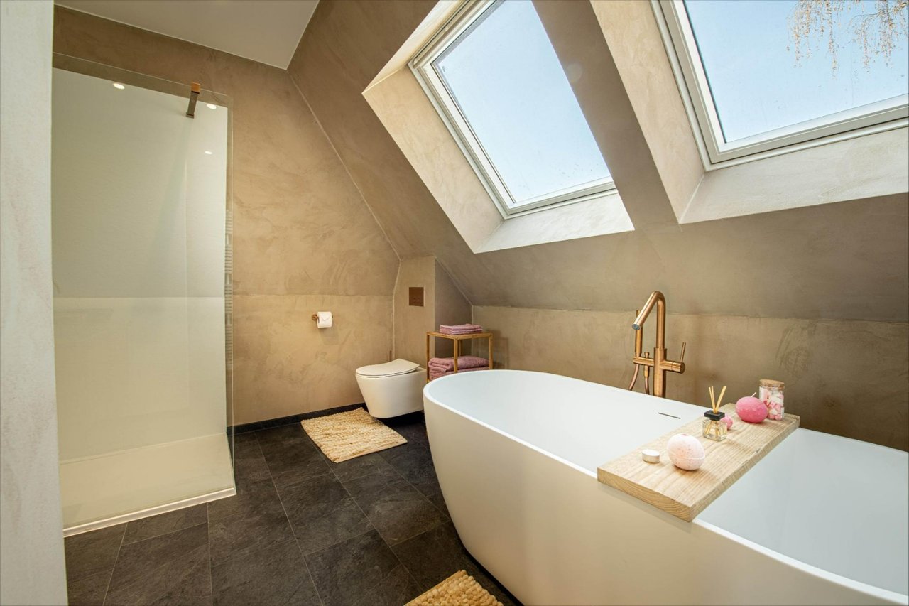 Hout in de badkamer is weer helemaal terug in en staat garant voor een warm uiterlijk. Het Balmani Forma meubel in teakhout maakt de badkamer helemaal zen en waterproof. In de aparte toiletruimte keert het design terug, want daar koos het stel voor een toiletmeubel met hetzelfde elegante lijnenspel.