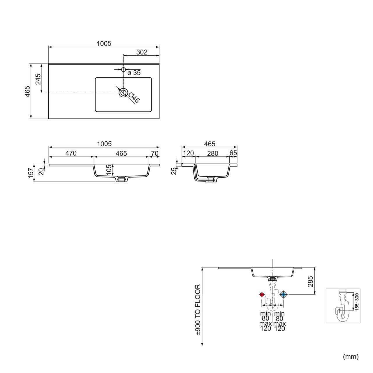 Afmetingen | 100 x 46 cm asymmetrisch rechts | |