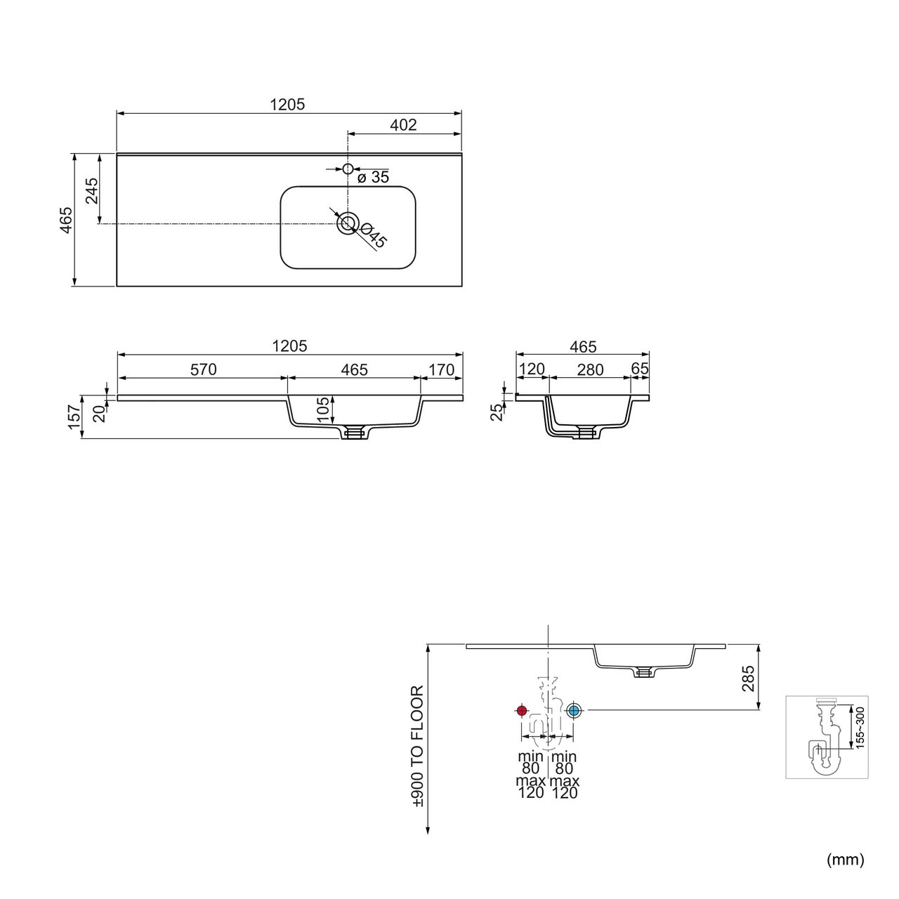 Afmetingen | 120 x 46 cm asymmetrisch rechts | |