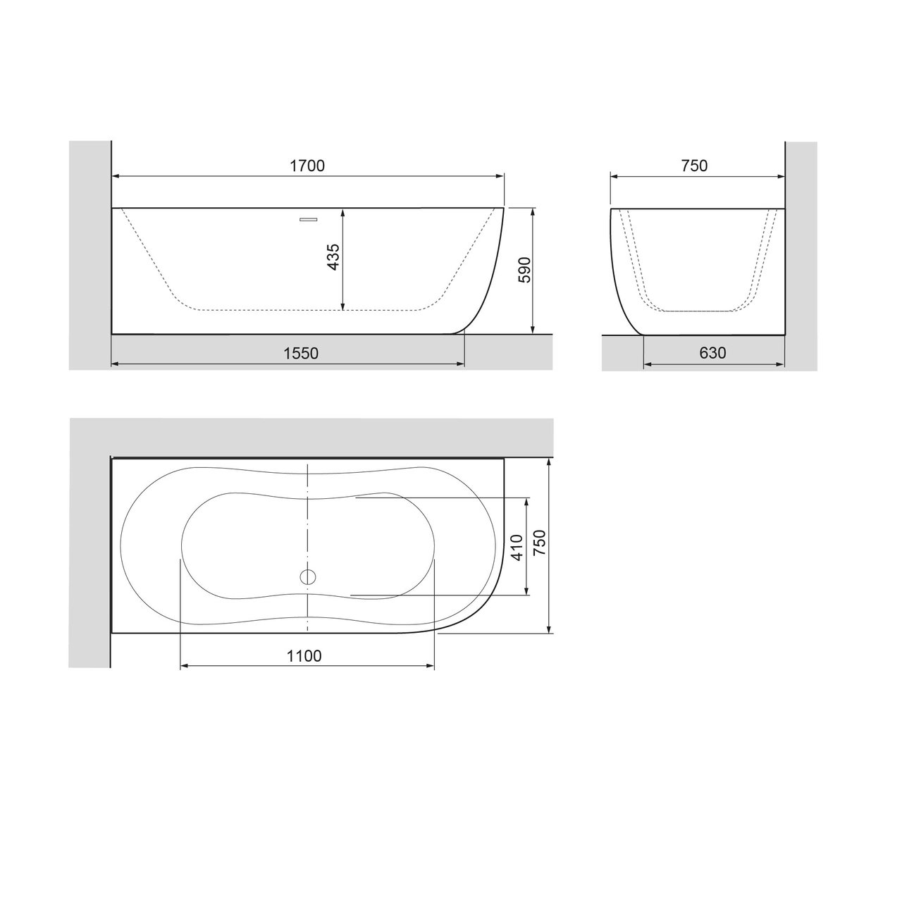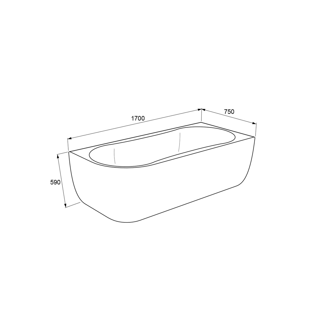 Dit bad is 75 cm breed en 170 cm lang en geschikt voor een rechter hoek.