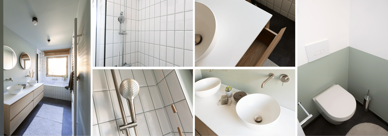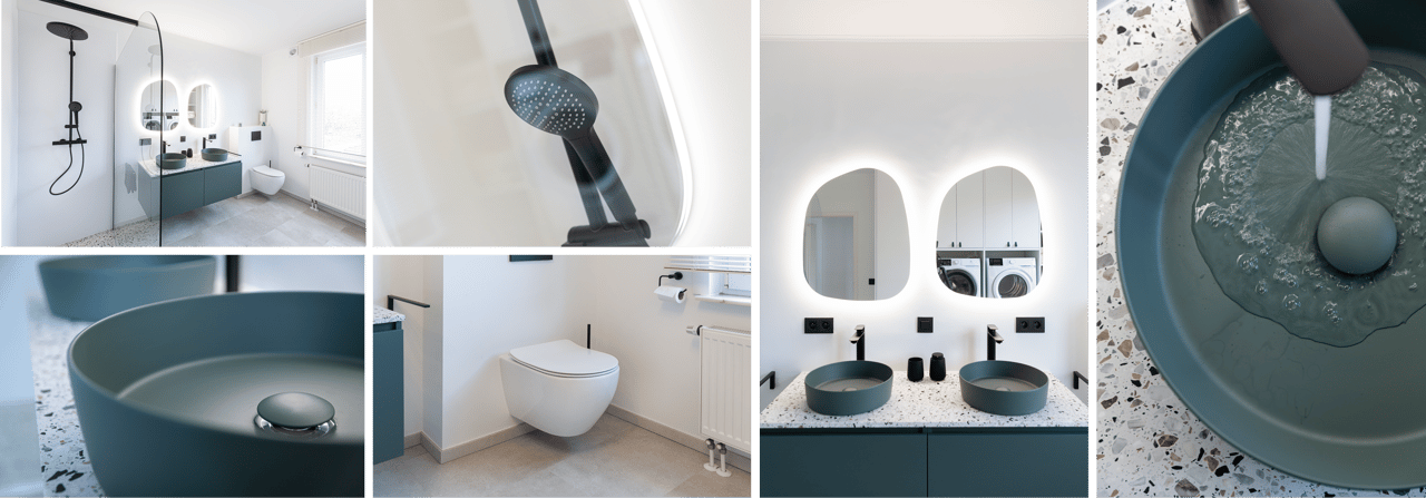 Strakke lijnen, karaktervolle accenten en slimme contrasten maken van deze badkamer een stijlvolle blikvanger. De opzetwastafels in matgroen combineren prachtig met het terrazzo werkblad en de zwarte kranen. Organisch gevormde spiegels met zachte LED-verlichting zorgen voor sfeer en functionaliteit. Dankzij het minimalistische toilet en de ruime inloopdouche blijft de ruimte open en luchtig. Een perfecte mix van modern comfort en uitgesproken stijl.