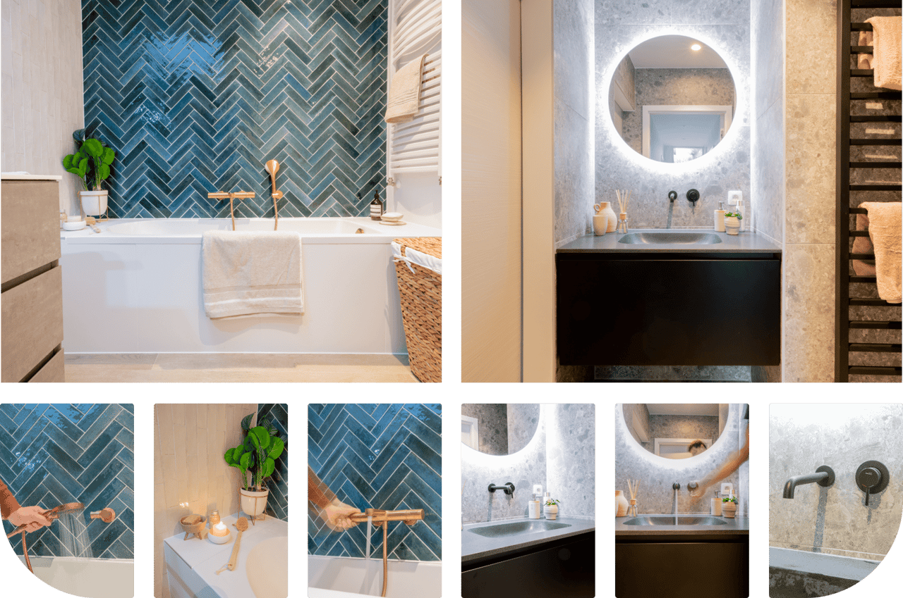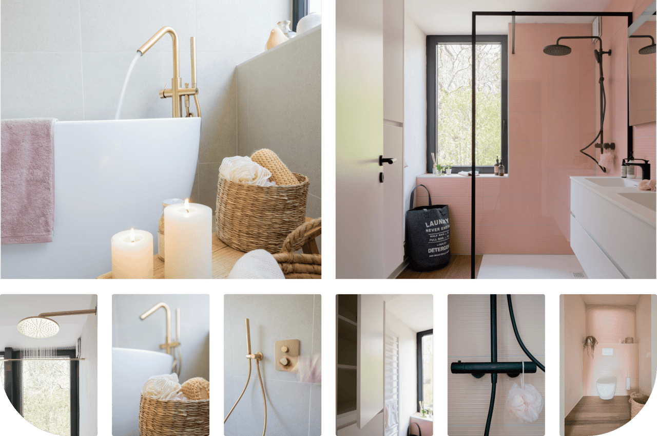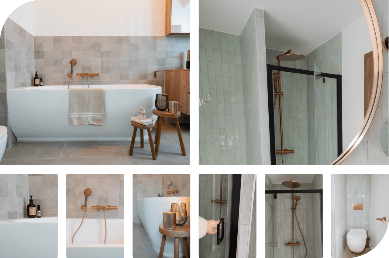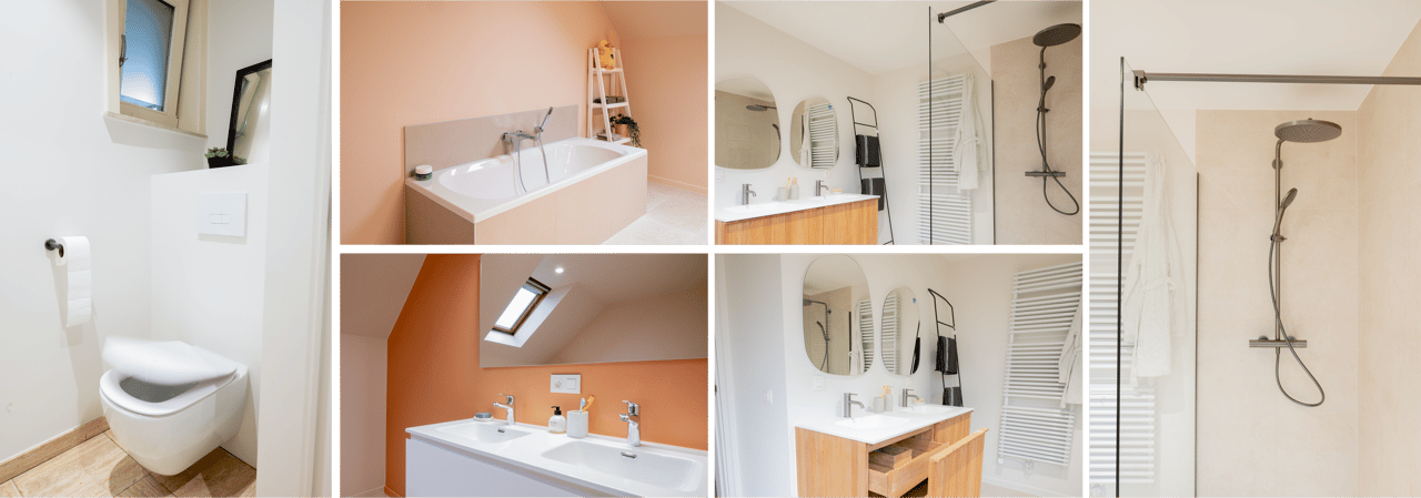 De eerste badkamer straalt warmte uit met perzikkleurige accenten, een vrijstaand ligbad en een dubbele wastafel onder een dakraam. In de tweede badkamer zorgen lichte materialen, een houten meubel met open lades en afgeronde spiegels voor een zachte, natuurlijke look. Het zijn ruimtes met slimme indelingen met inloopdouche, opbergruimte en veel daglicht — ideaal voor wie houdt van comfort en verfijning.