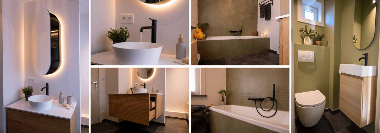 Deze badkamer combineert aardse tinten met strakke vormen en slimme opbergoplossingen. De olijfgroene accentmuur geeft karakter, terwijl het houten badkamermeubel met dubbele lades zorgt voor praktische ruimte. De spiegel met geïntegreerde verlichting en opbergruimte brengt zowel sfeer als functionaliteit. Het ruime ligbad maakt de wellnessbeleving compleet: een stijlvolle badkamer met oog voor rust, comfort en design.