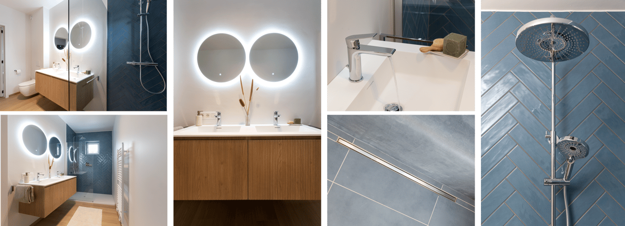 Deze badkamer combineert rust en eenvoud met moderne elegantie. De witte wandtegels zorgen voor een frisse basis, terwijl het hout van het zwevende meubel warmte toevoegt. De dubbele waskommen en strakke wandkranen geven het geheel een hedendaagse uitstraling. De ruime inloopdouche met subtiele details biedt comfort, terwijl het aparte toilet netjes is afgewerkt in een zachte groengrijze tint. Een tijdloos en harmonieus ontwerp waar functionaliteit en stijl perfect samenkomen.