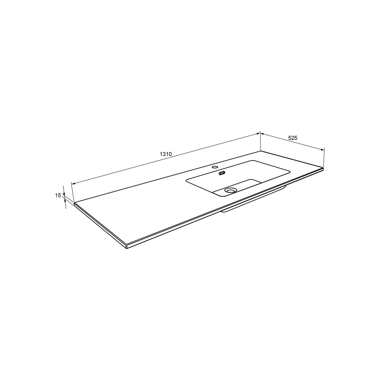 Deze asymmetrische composiet marmeren wastafel met geïntegreerde waskom heeft een breedte van 130 cm, een diepte van 52 cm en een randhoogte van 1,5 cm. Deze glanzende wit wastafel past in elke badkamer door zijn strakke afwerking.