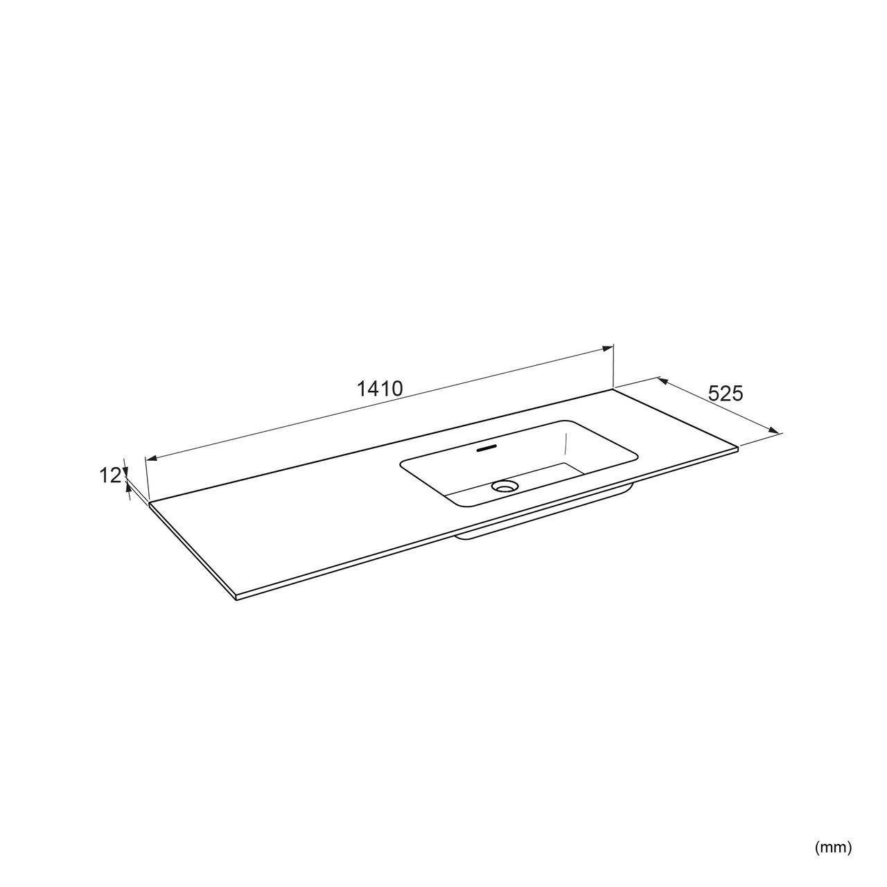 Deze asymmetrische Solid Surface wastafel met geïntegreerde waskom heeft een breedte van 140 cm, een diepte van 52 cm en een randhoogte van 1,2 cm. Deze mat witte wastafel past in elke badkamer door zijn elegante afwerking.
