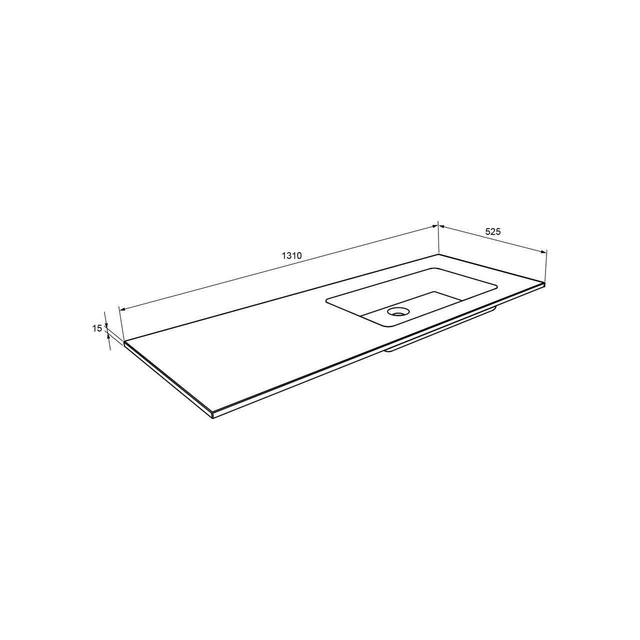 Deze asymmetrische kwarts wastafel met geïntegreerde waskom heeft een breedte van 130 cm, een diepte van 52 cm en een randhoogte van 1,5 cm. Deze mat zwarte wastafel past in elke badkamer door zijn strakke afwerking.