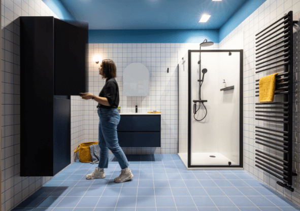 Deze badkamer bewijst dat kleur en minimalisme perfect samengaan. Een inspirerende ruimte die frisheid en rust uitstraalt en een stijlvolle basis vormt voor elke dag.