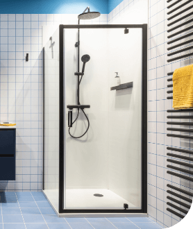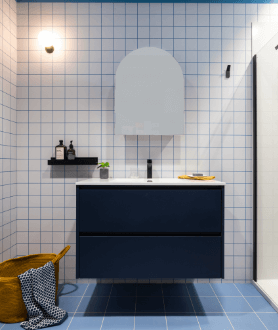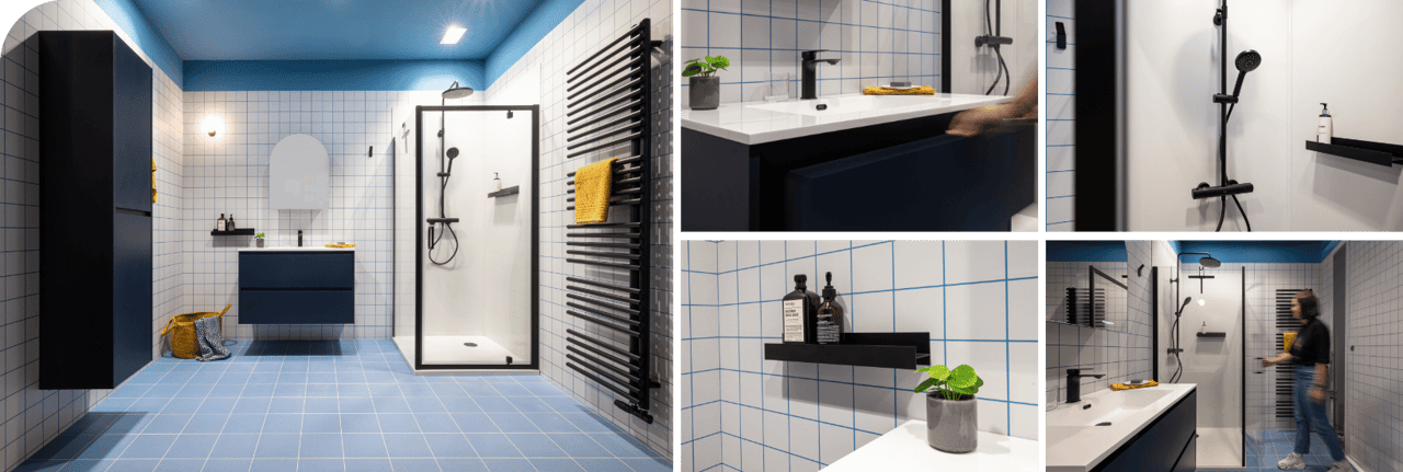 Een badkamer waar frisheid en functionaliteit perfect samenkomen. Het diepe blauw geeft deze ruimte een karaktervolle uitstraling, terwijl de minimalistische meubels en strakke lijnen zorgen voor een Scandinavisch gevoel. Dankzij de slimme opbergruimte blijft de badkamer altijd netjes en opgeruimd.
