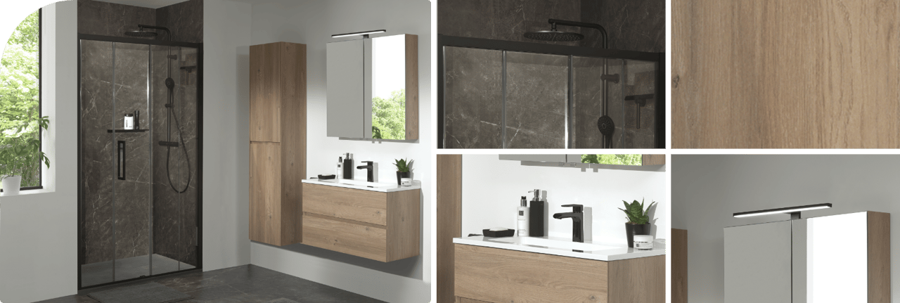 In deze badkamer komen natuurlijke materialen en hedendaags design samen in een warme, uitnodigende sfeer. De combinatie van zwarte accenten met eik zorgt voor een tijdloos geheel met karakter. De ruime douche met schuifdeur biedt alle comfort, terwijl de praktische spiegelkast en hangkasten zorgen voor extra opbergruimte zonder in te boeten op stijl.